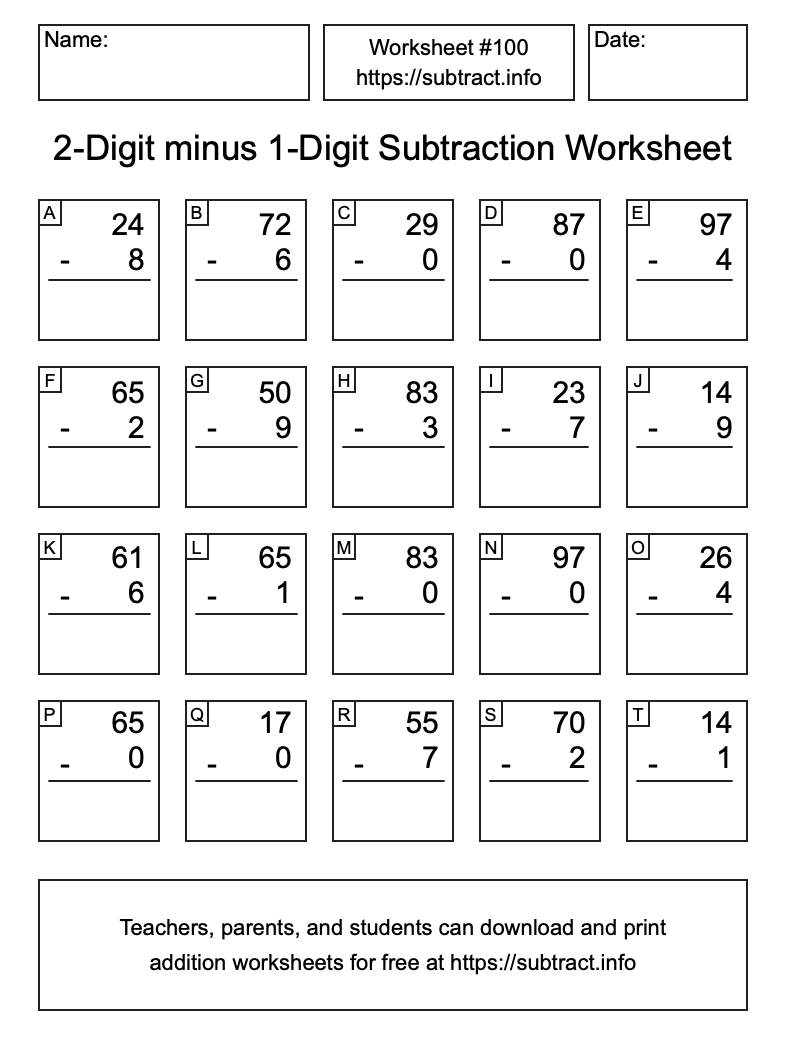 Go here to download, save, and print other subtraction worksheets. Information about how to find all solutions and how to reprint worksheets is also available here.