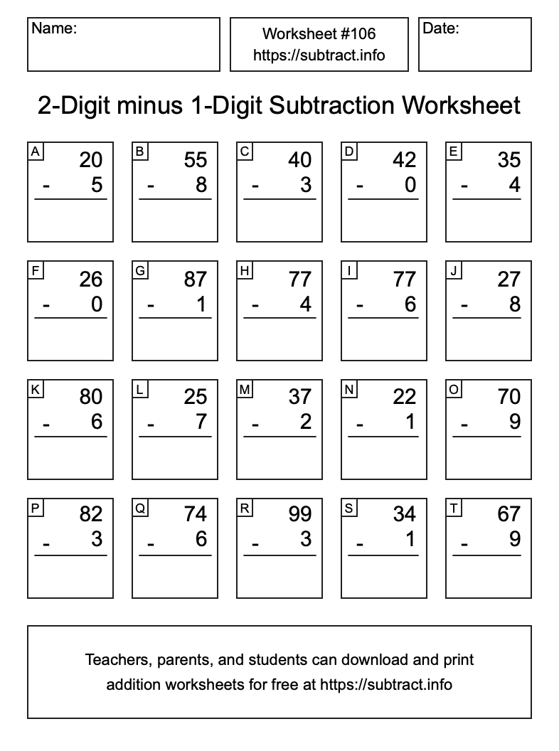 Here is the 2-Digit minus 1-Digit Subtraction Worksheet #106. Print and/or save the worksheet using the buttons below the image. You can also drag or right-click on the image to download it to your device.