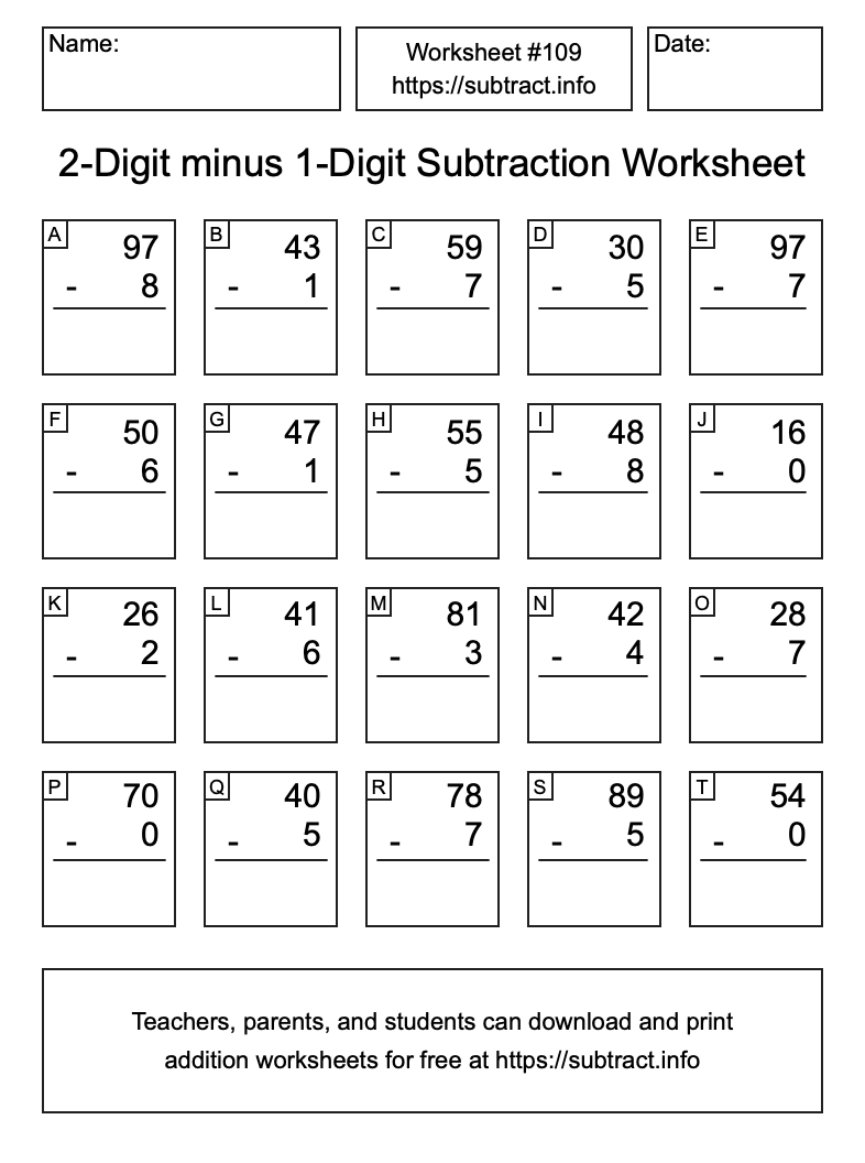 Here is the 2-Digit minus 1-Digit Subtraction Worksheet #109. Print and/or save the worksheet using the buttons below the image. You can also drag or right-click on the image to download it to your device.