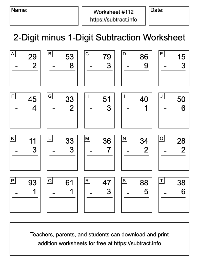 Here is the 2-Digit minus 1-Digit Subtraction Worksheet #112. Print and/or save the worksheet using the buttons below the image. You can also drag or right-click on the image to download it to your device.