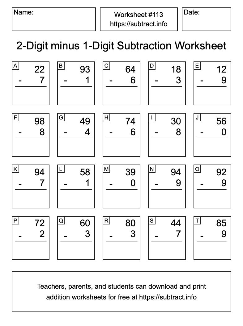Here is the 2-Digit minus 1-Digit Subtraction Worksheet #113. Print and/or save the worksheet using the buttons below the image. You can also drag or right-click on the image to download it to your device.