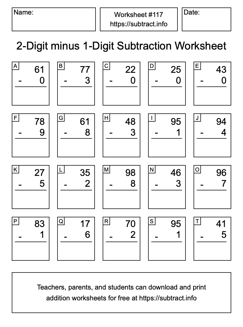 Here is the 2-Digit minus 1-Digit Subtraction Worksheet #117. Print and/or save the worksheet using the buttons below the image. You can also drag or right-click on the image to download it to your device.