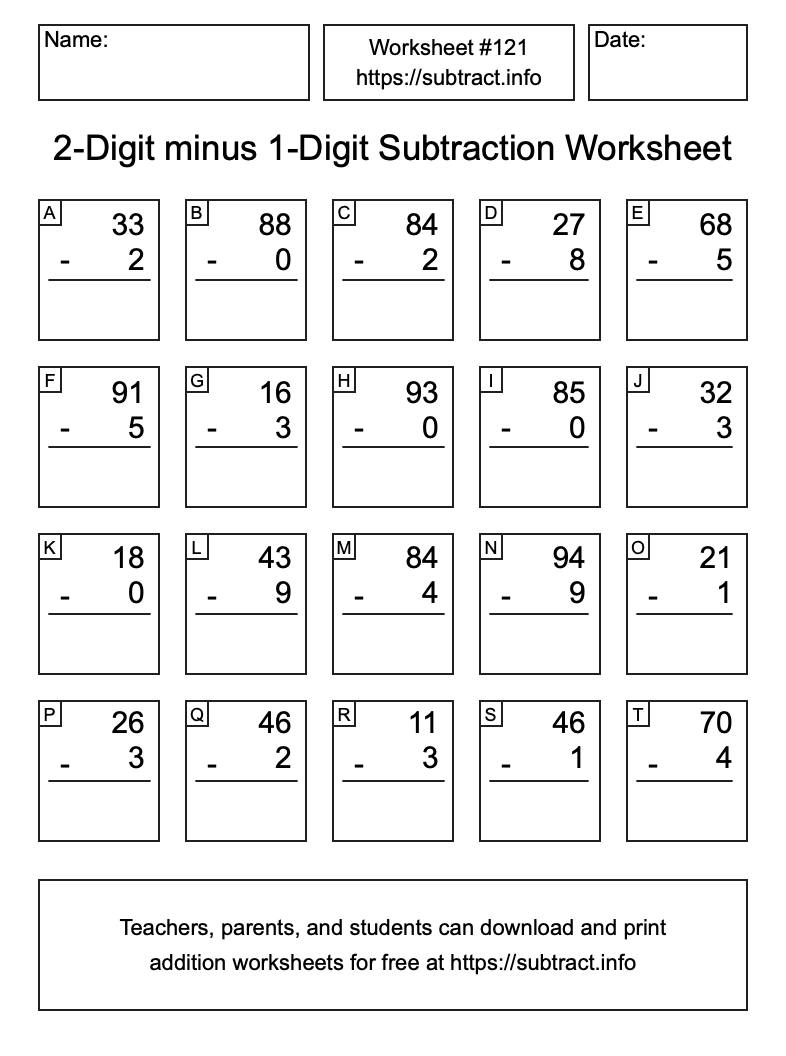 Here is the 2-Digit minus 1-Digit Subtraction Worksheet #121. Print and/or save the worksheet using the buttons below the image. You can also drag or right-click on the image to download it to your device.