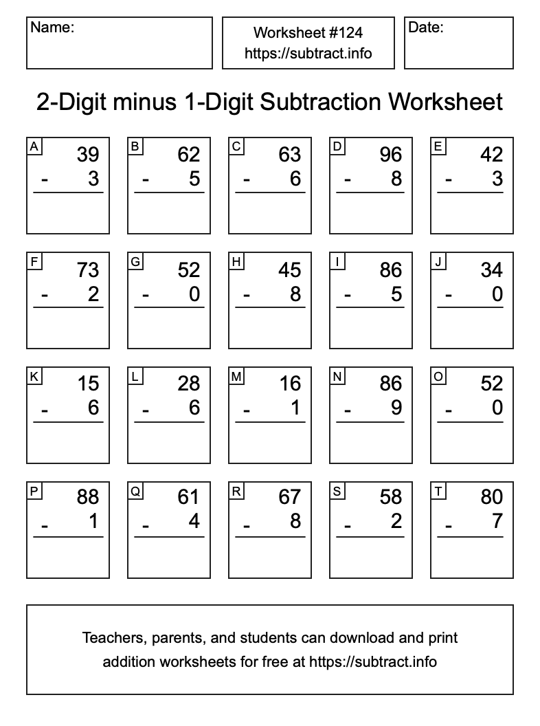Here is the 2-Digit minus 1-Digit Subtraction Worksheet #124. Print and/or save the worksheet using the buttons below the image. You can also drag or right-click on the image to download it to your device.