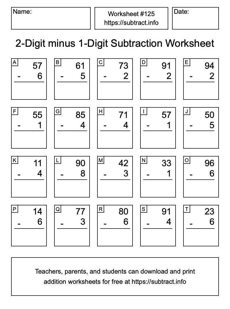 Here is the 2-Digit minus 1-Digit Subtraction Worksheet #125. Print and/or save the worksheet using the buttons below the image. You can also drag or right-click on the image to download it to your device.
