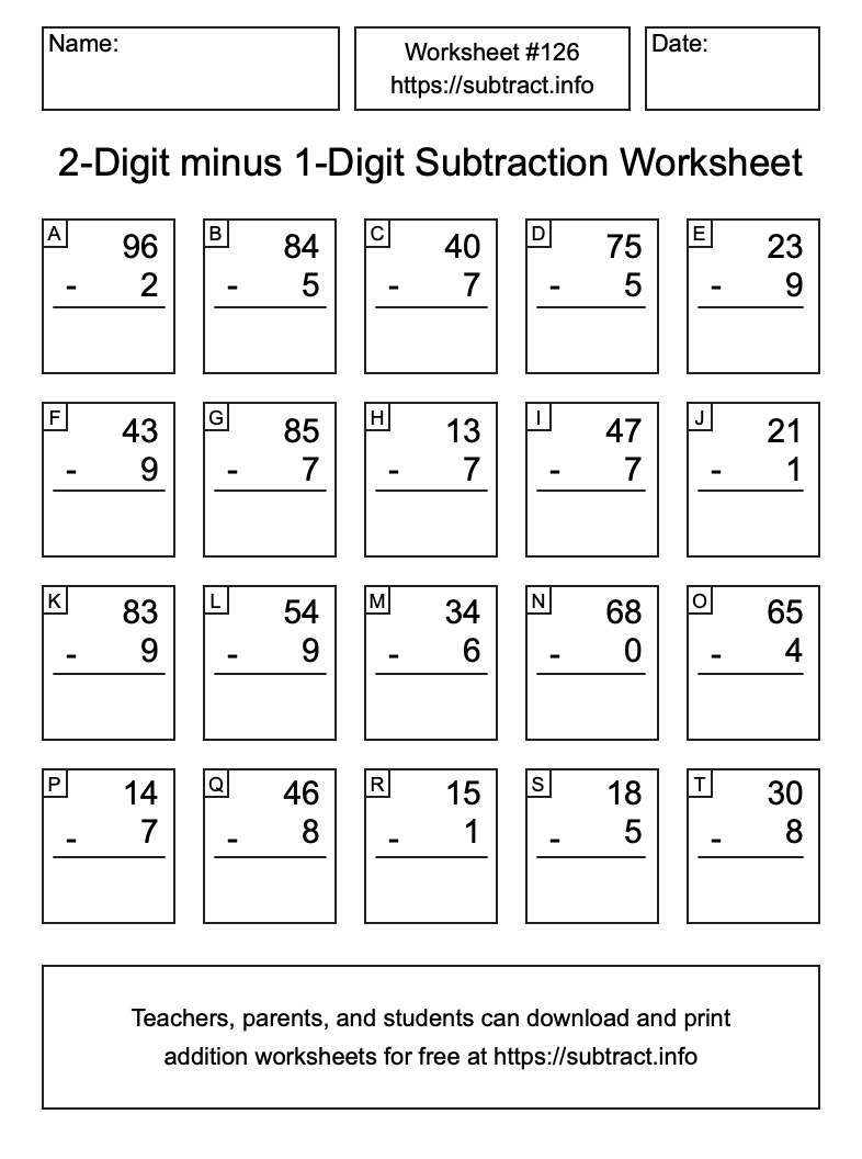 Here is the 2-Digit minus 1-Digit Subtraction Worksheet #126. Print and/or save the worksheet using the buttons below the image. You can also drag or right-click on the image to download it to your device.