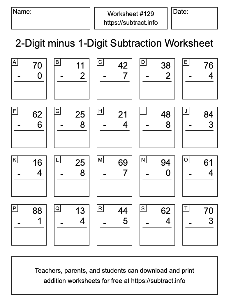Here is the 2-Digit minus 1-Digit Subtraction Worksheet #129. Print and/or save the worksheet using the buttons below the image. You can also drag or right-click on the image to download it to your device.