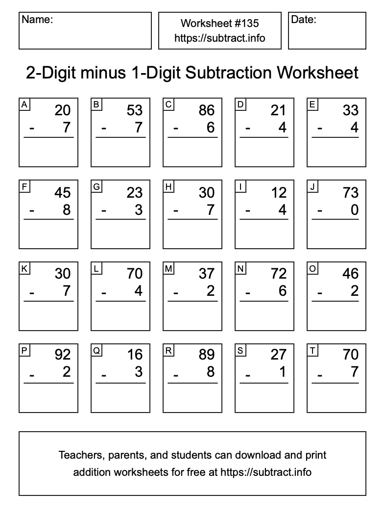 Go here to download, save, and print other subtraction worksheets. Information about how to find all solutions and how to reprint worksheets is also available here.