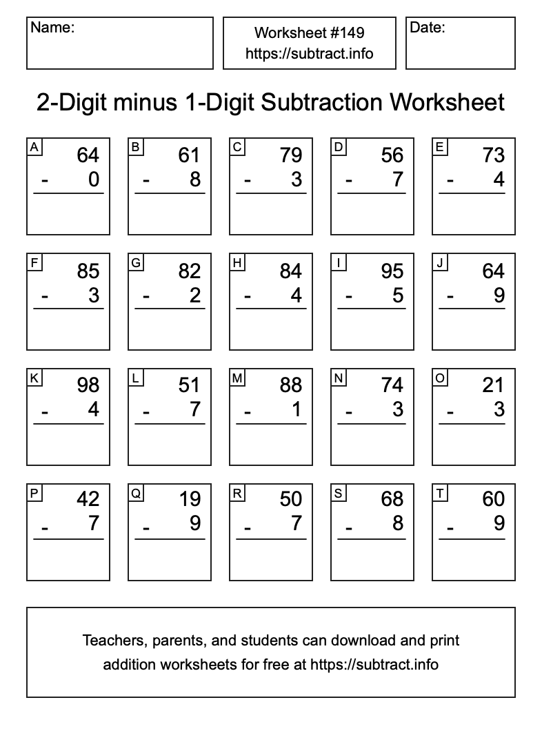 Here is the 2-Digit minus 1-Digit Subtraction Worksheet #149. Print and/or save the worksheet using the buttons below the image. You can also drag or right-click on the image to download it to your device.