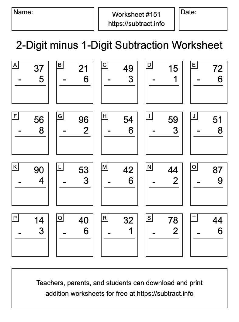 Here is the 2-Digit minus 1-Digit Subtraction Worksheet #151. Print and/or save the worksheet using the buttons below the image. You can also drag or right-click on the image to download it to your device.