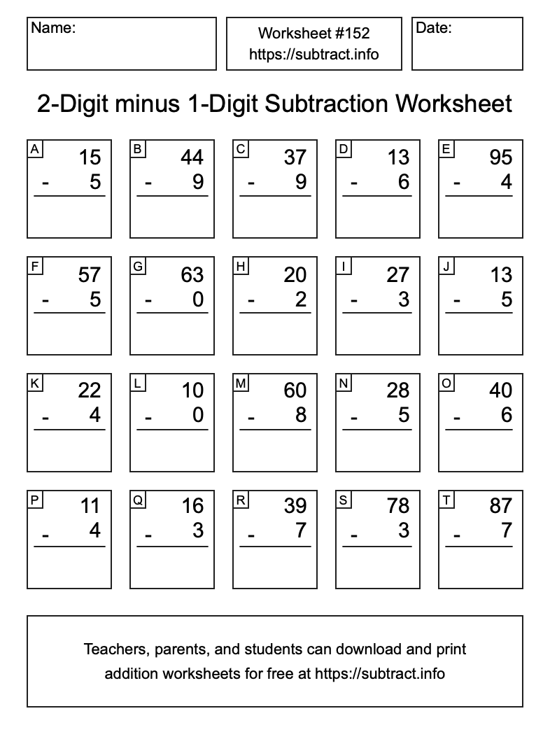 Here is the 2-Digit minus 1-Digit Subtraction Worksheet #152. Print and/or save the worksheet using the buttons below the image. You can also drag or right-click on the image to download it to your device.