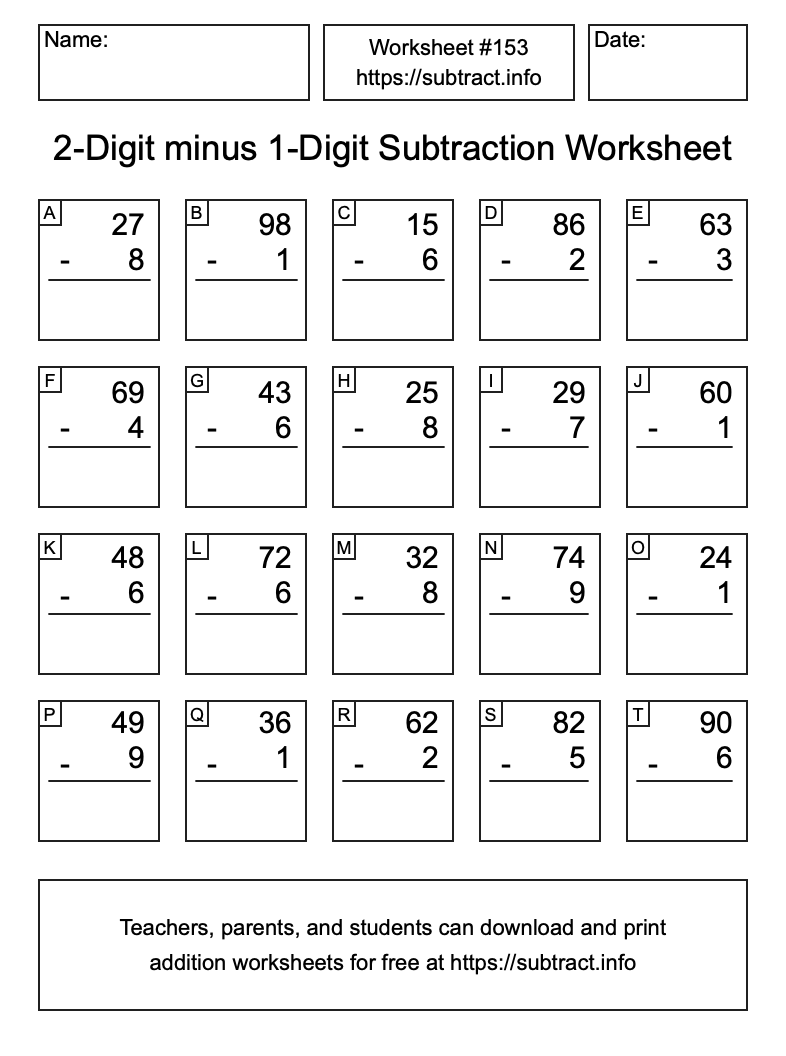 Here is the 2-Digit minus 1-Digit Subtraction Worksheet #153. Print and/or save the worksheet using the buttons below the image. You can also drag or right-click on the image to download it to your device.