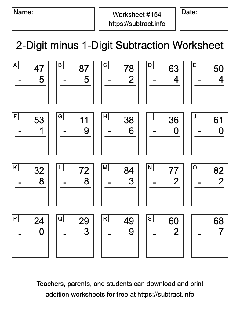 Here is the 2-Digit minus 1-Digit Subtraction Worksheet #154. Print and/or save the worksheet using the buttons below the image. You can also drag or right-click on the image to download it to your device.