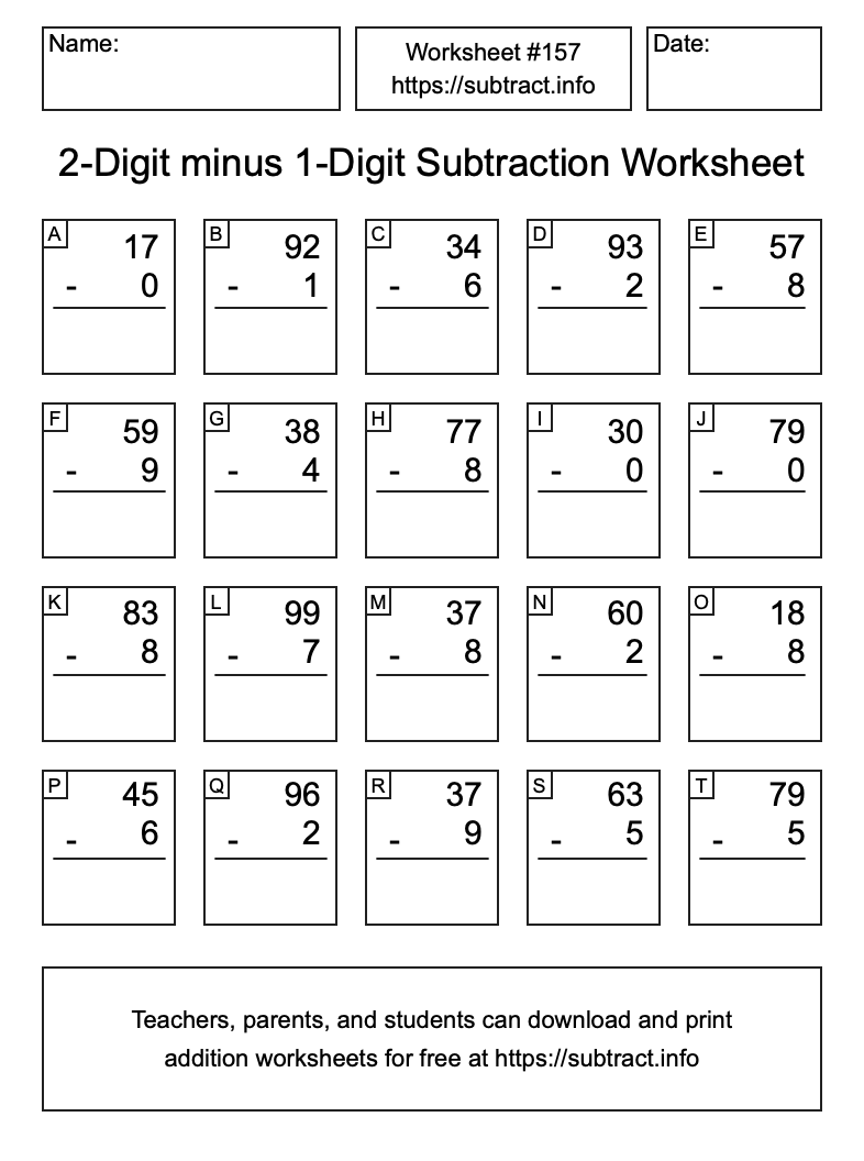 Here is the 2-Digit minus 1-Digit Subtraction Worksheet #157. Print and/or save the worksheet using the buttons below the image. You can also drag or right-click on the image to download it to your device.