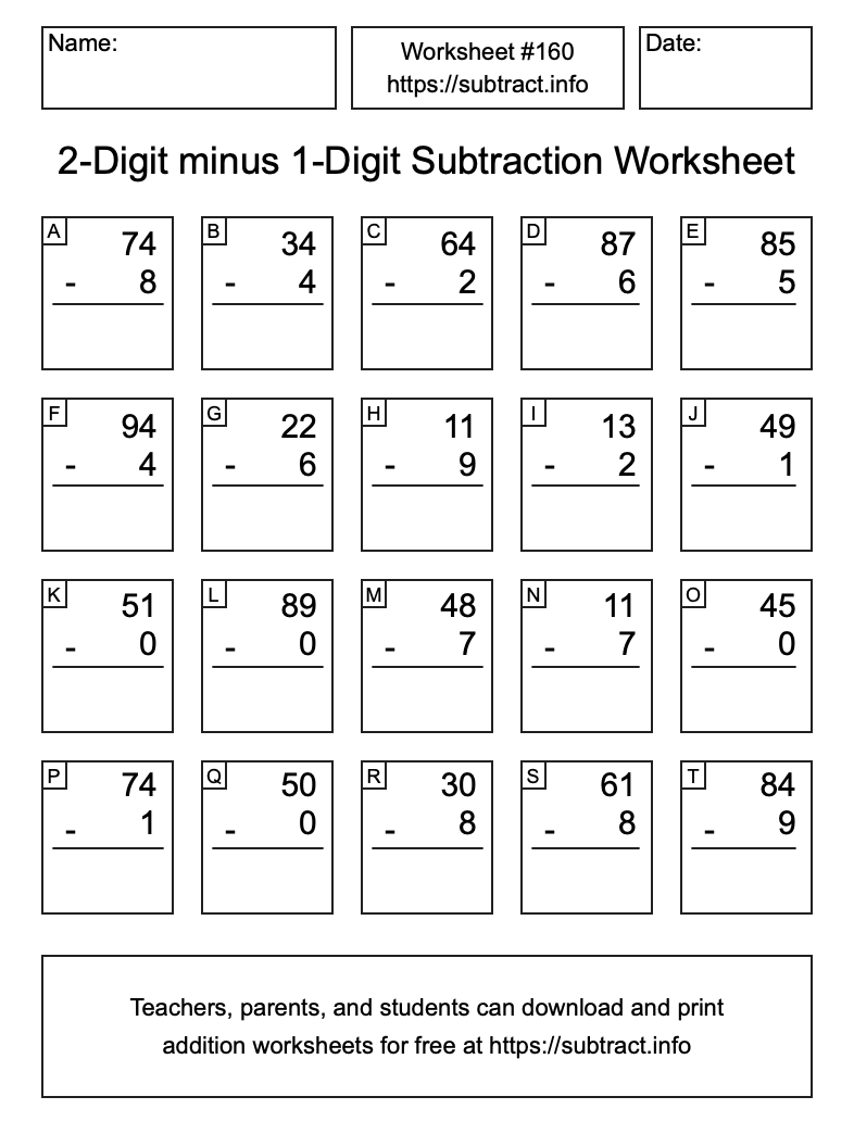 Here is the 2-Digit minus 1-Digit Subtraction Worksheet #160. Print and/or save the worksheet using the buttons below the image. You can also drag or right-click on the image to download it to your device.