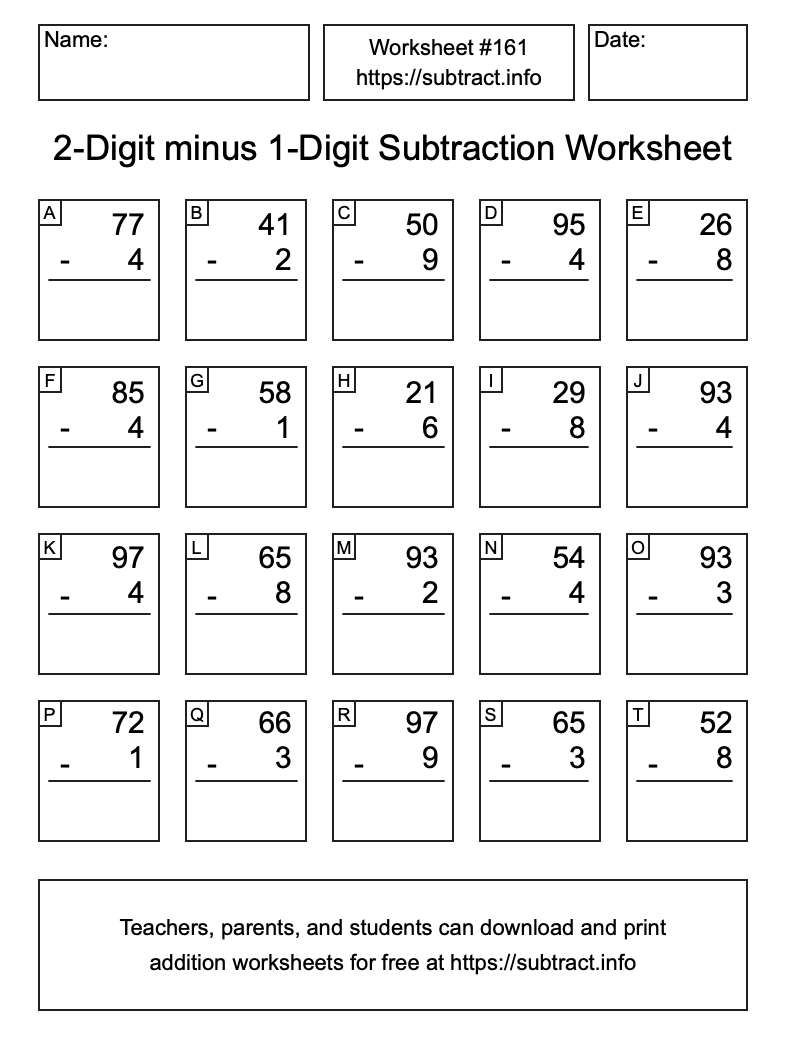 Here is the 2-Digit minus 1-Digit Subtraction Worksheet #161. Print and/or save the worksheet using the buttons below the image. You can also drag or right-click on the image to download it to your device.