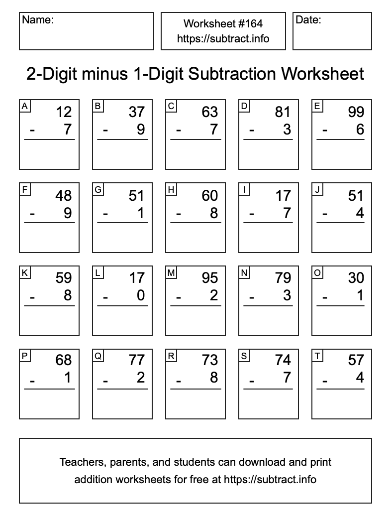Here is the 2-Digit minus 1-Digit Subtraction Worksheet #164. Print and/or save the worksheet using the buttons below the image. You can also drag or right-click on the image to download it to your device.