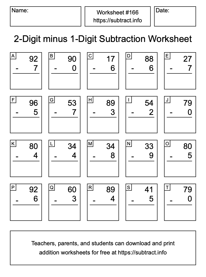 Here is the 2-Digit minus 1-Digit Subtraction Worksheet #166. Print and/or save the worksheet using the buttons below the image. You can also drag or right-click on the image to download it to your device.