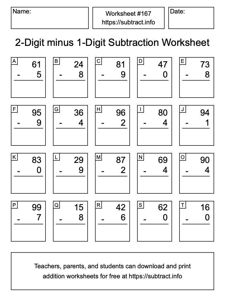 Here is the 2-Digit minus 1-Digit Subtraction Worksheet #167. Print and/or save the worksheet using the buttons below the image. You can also drag or right-click on the image to download it to your device.