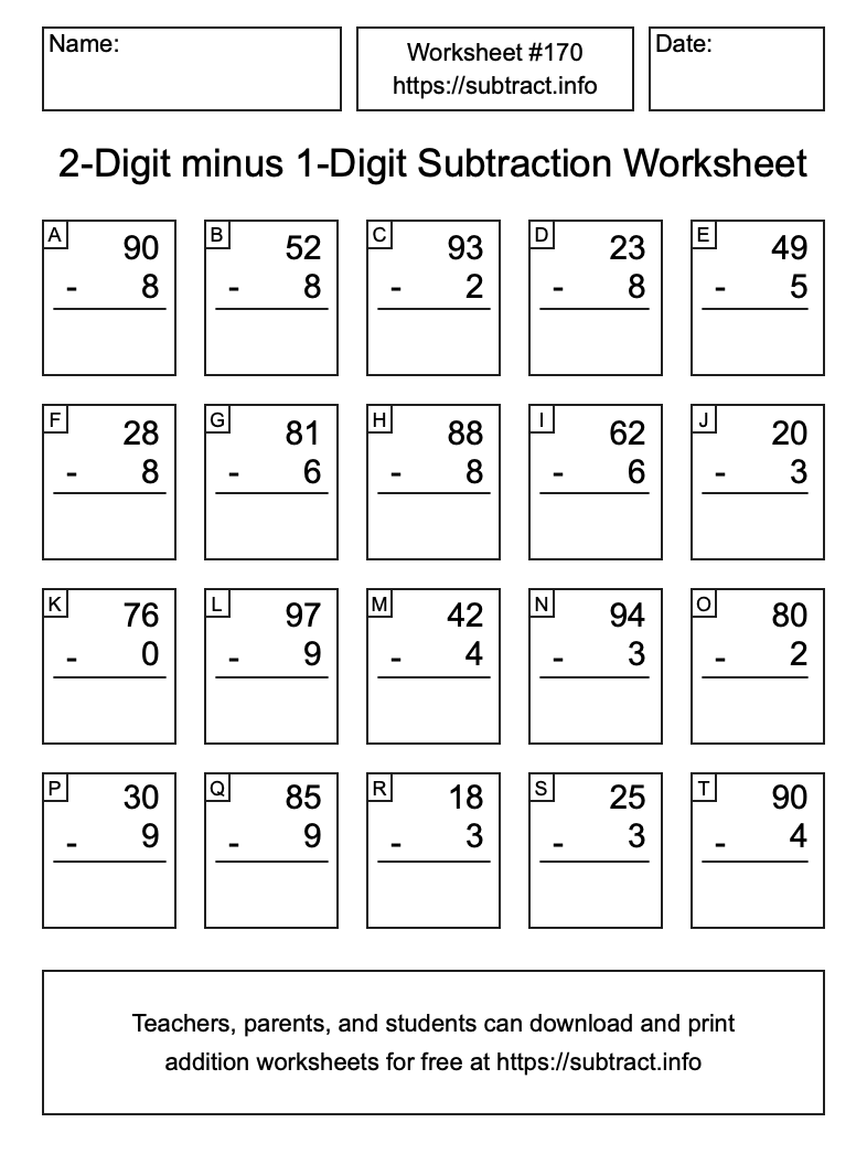 Here is the 2-Digit minus 1-Digit Subtraction Worksheet #170. Print and/or save the worksheet using the buttons below the image. You can also drag or right-click on the image to download it to your device.