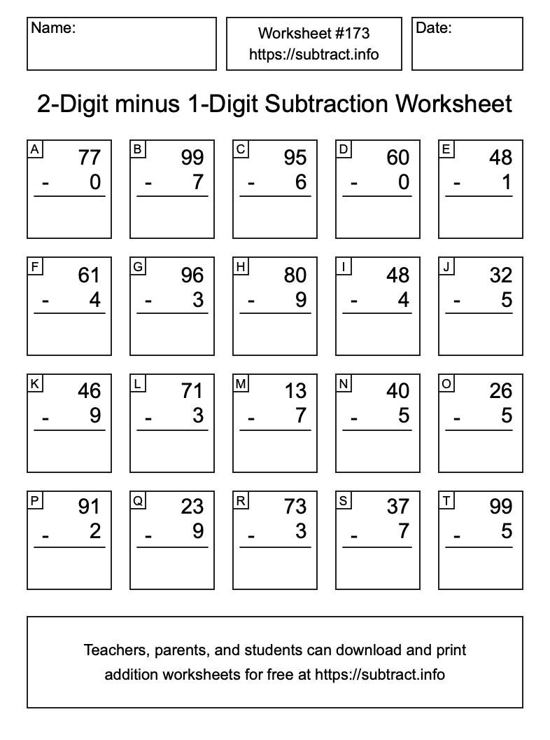 Here is the 2-Digit minus 1-Digit Subtraction Worksheet #173. Print and/or save the worksheet using the buttons below the image. You can also drag or right-click on the image to download it to your device.