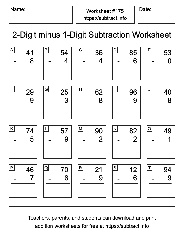 Here is the 2-Digit minus 1-Digit Subtraction Worksheet #175. Print and/or save the worksheet using the buttons below the image. You can also drag or right-click on the image to download it to your device.