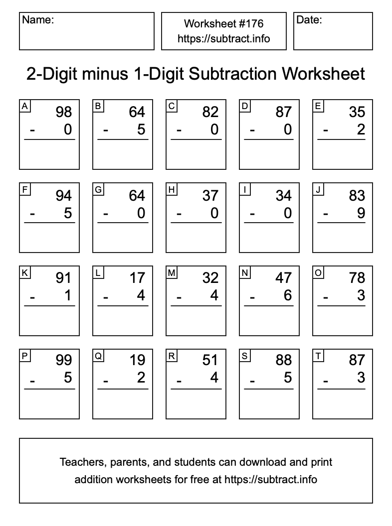 Here is the 2-Digit minus 1-Digit Subtraction Worksheet #176. Print and/or save the worksheet using the buttons below the image. You can also drag or right-click on the image to download it to your device.