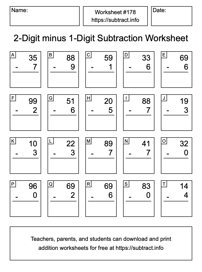 Here is the 2-Digit minus 1-Digit Subtraction Worksheet #178. Print and/or save the worksheet using the buttons below the image. You can also drag or right-click on the image to download it to your device.