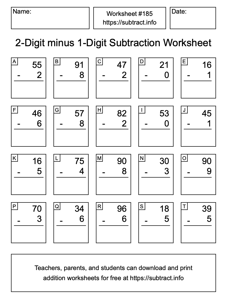 Here is the 2-Digit minus 1-Digit Subtraction Worksheet #185. Print and/or save the worksheet using the buttons below the image. You can also drag or right-click on the image to download it to your device.