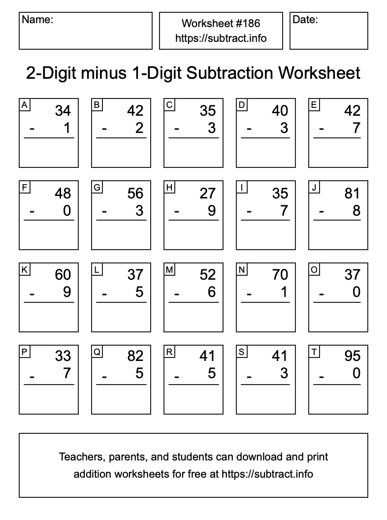 Here is the 2-Digit minus 1-Digit Subtraction Worksheet #186. Print and/or save the worksheet using the buttons below the image. You can also drag or right-click on the image to download it to your device.