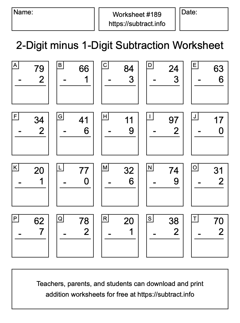 Here is the 2-Digit minus 1-Digit Subtraction Worksheet #189. Print and/or save the worksheet using the buttons below the image. You can also drag or right-click on the image to download it to your device.