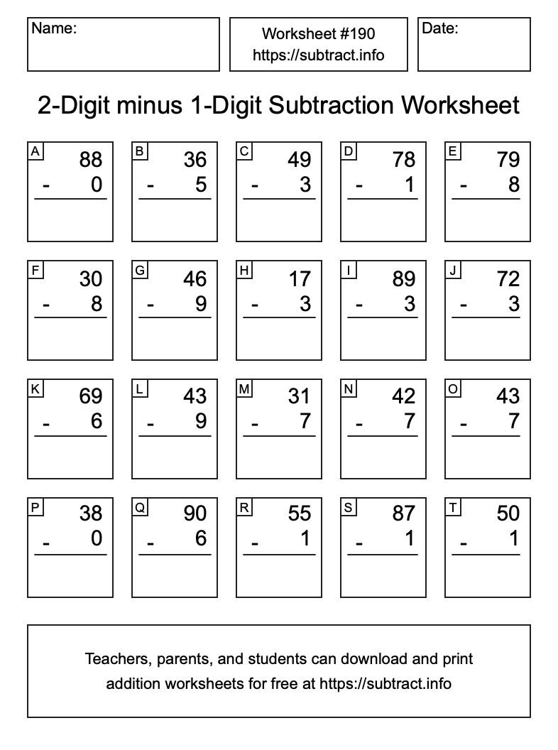 Here is the 2-Digit minus 1-Digit Subtraction Worksheet #190. Print and/or save the worksheet using the buttons below the image. You can also drag or right-click on the image to download it to your device.