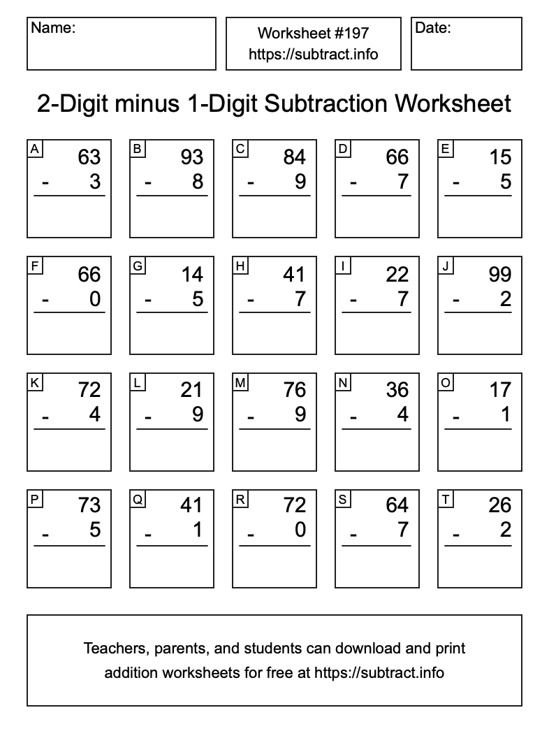 Here is the 2-Digit minus 1-Digit Subtraction Worksheet #197. Print and/or save the worksheet using the buttons below the image. You can also drag or right-click on the image to download it to your device.