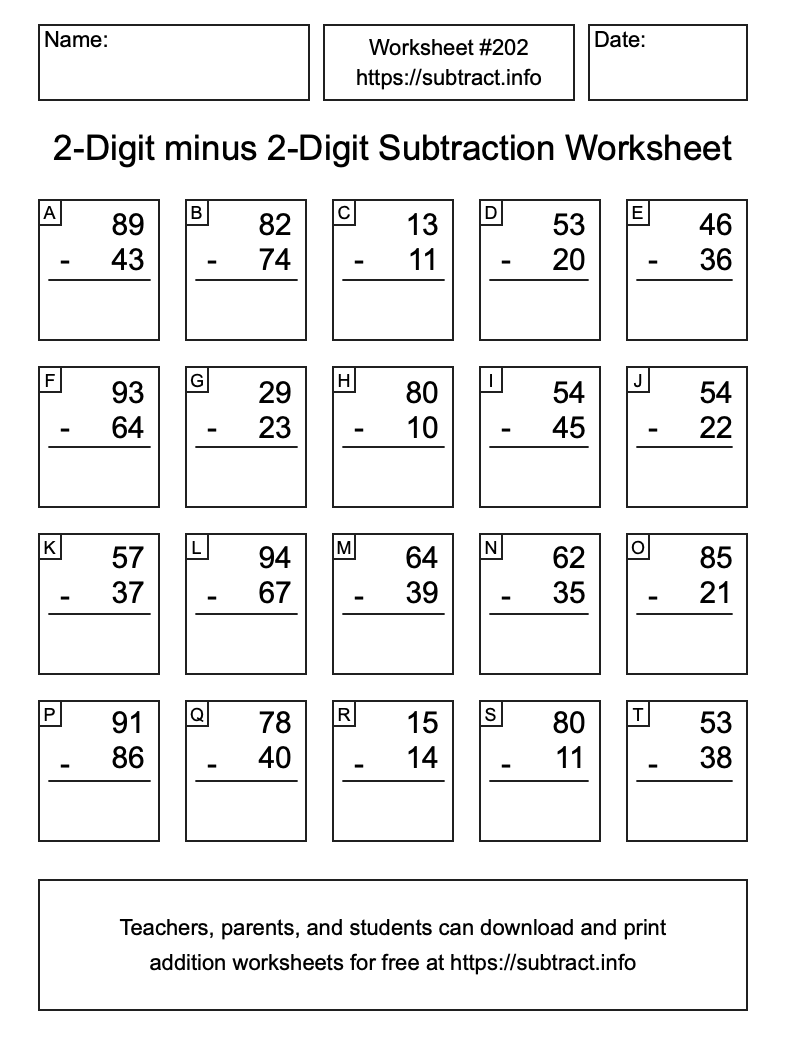 Here is the 2-Digit minus 2-Digit Subtraction Worksheet #202. Print and/or save the worksheet using the buttons below the image. You can also drag or right-click on the image to download it to your device.
