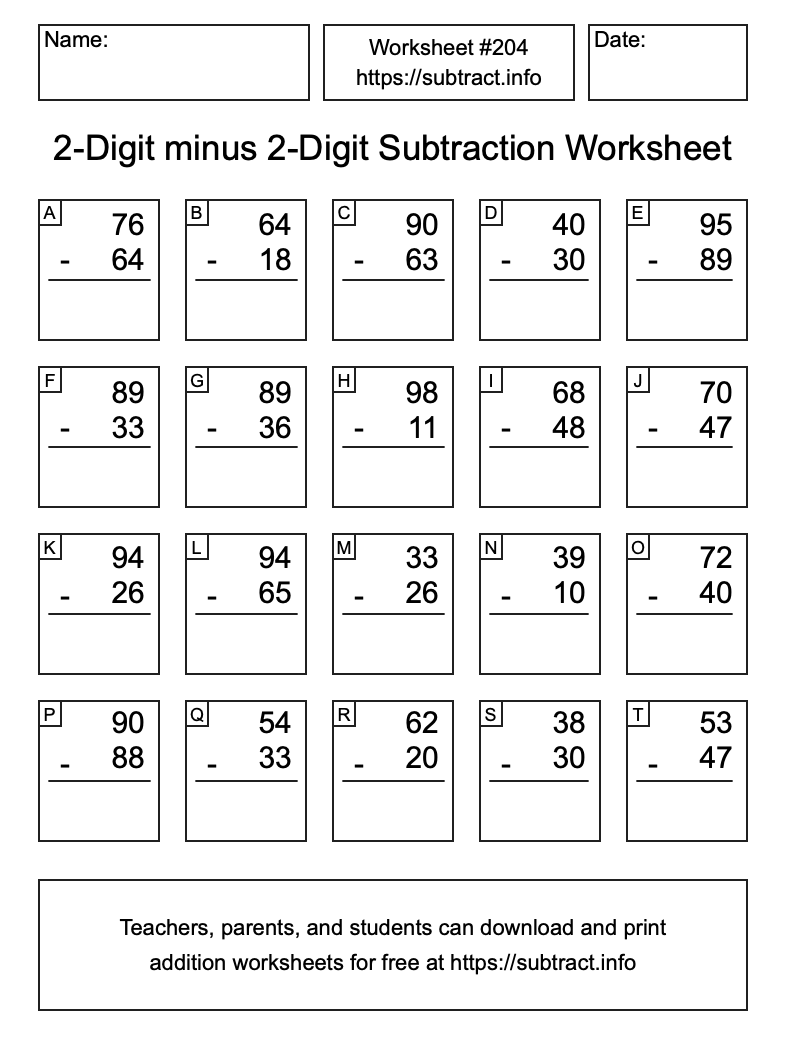 Here is the 2-Digit minus 2-Digit Subtraction Worksheet #204. Print and/or save the worksheet using the buttons below the image. You can also drag or right-click on the image to download it to your device.