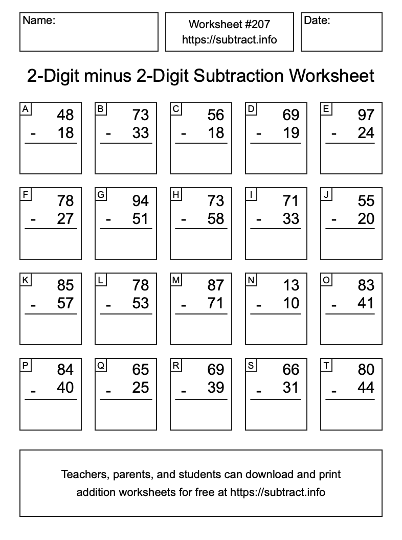 Here is the 2-Digit minus 2-Digit Subtraction Worksheet #207. Print and/or save the worksheet using the buttons below the image. You can also drag or right-click on the image to download it to your device.