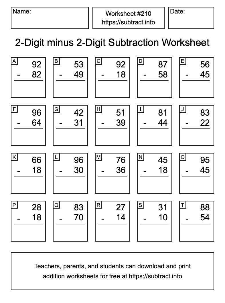 Here is the 2-Digit minus 2-Digit Subtraction Worksheet #210. Print and/or save the worksheet using the buttons below the image. You can also drag or right-click on the image to download it to your device.
