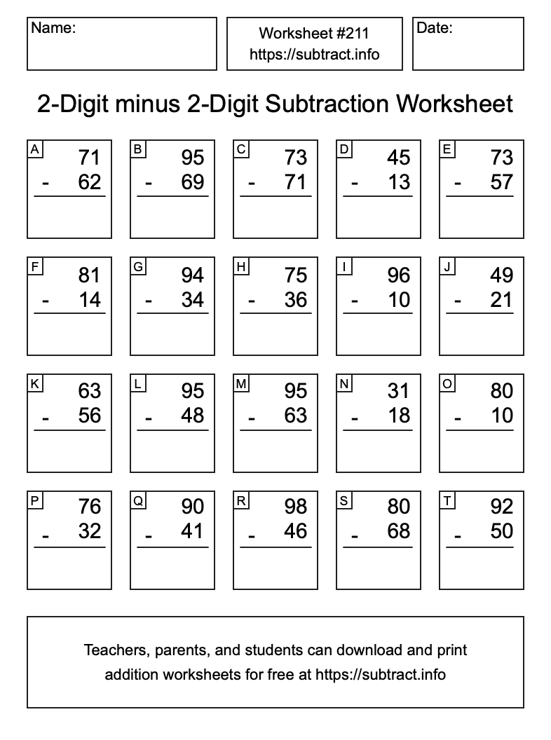 Here is the 2-Digit minus 2-Digit Subtraction Worksheet #211. Print and/or save the worksheet using the buttons below the image. You can also drag or right-click on the image to download it to your device.
