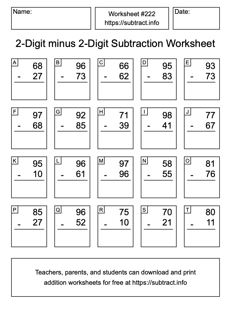 Here is the 2-Digit minus 2-Digit Subtraction Worksheet #222. Print and/or save the worksheet using the buttons below the image. You can also drag or right-click on the image to download it to your device.