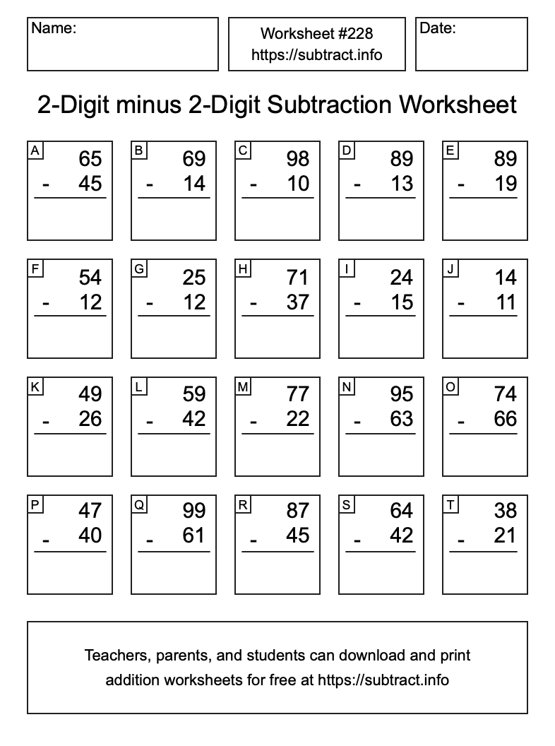 Here is the 2-Digit minus 2-Digit Subtraction Worksheet #228. Print and/or save the worksheet using the buttons below the image. You can also drag or right-click on the image to download it to your device.