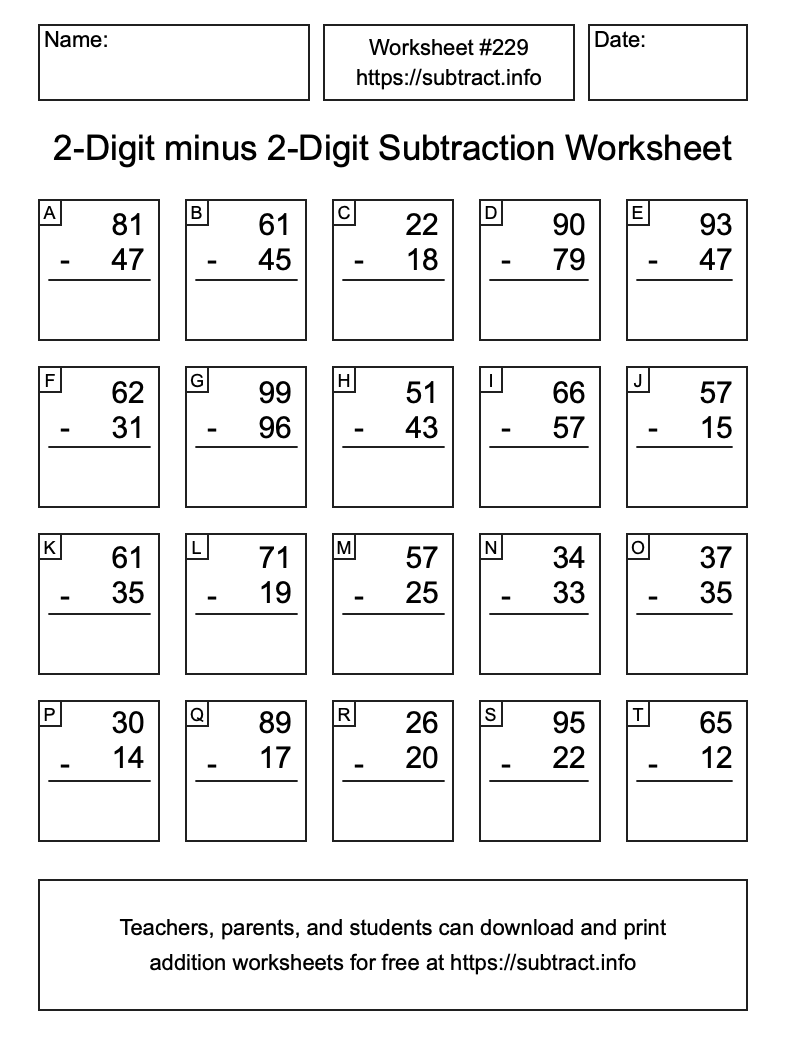 Here is the 2-Digit minus 2-Digit Subtraction Worksheet #229. Print and/or save the worksheet using the buttons below the image. You can also drag or right-click on the image to download it to your device.