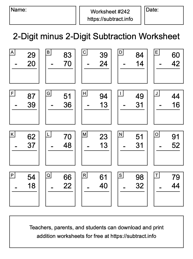 Here is the 2-Digit minus 2-Digit Subtraction Worksheet #242. Print and/or save the worksheet using the buttons below the image. You can also drag or right-click on the image to download it to your device.