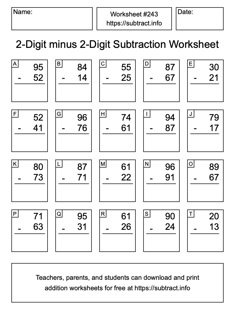 Here is the 2-Digit minus 2-Digit Subtraction Worksheet #243. Print and/or save the worksheet using the buttons below the image. You can also drag or right-click on the image to download it to your device.