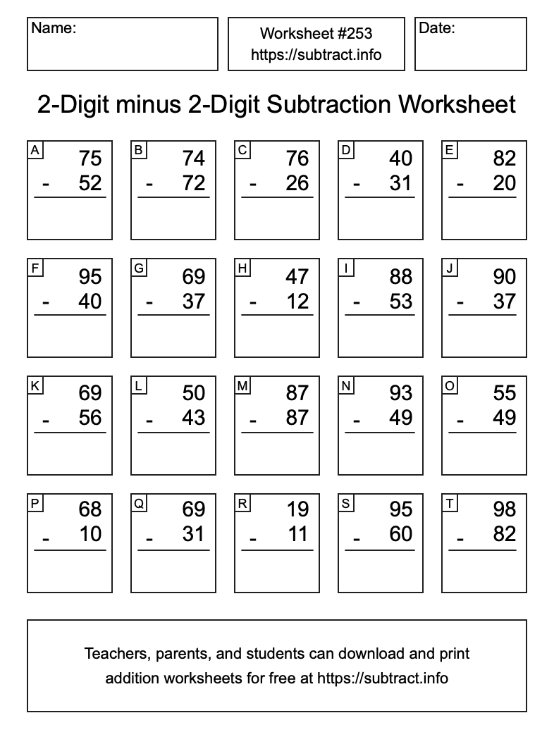 Here is the 2-Digit minus 2-Digit Subtraction Worksheet #253. Print and/or save the worksheet using the buttons below the image. You can also drag or right-click on the image to download it to your device.