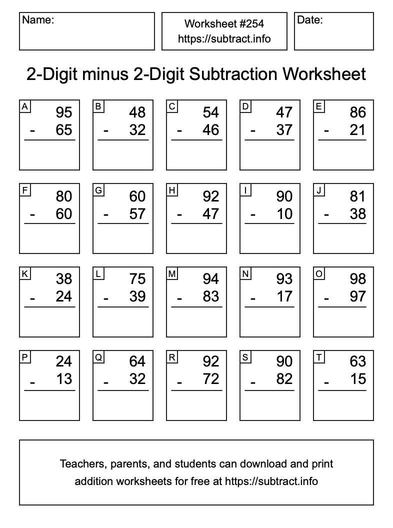 Here is the 2-Digit minus 2-Digit Subtraction Worksheet #254. Print and/or save the worksheet using the buttons below the image. You can also drag or right-click on the image to download it to your device.