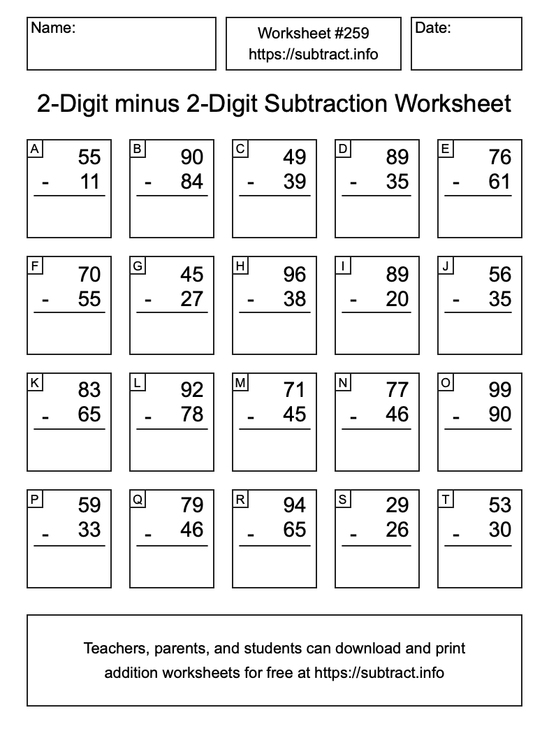 Here is the 2-Digit minus 2-Digit Subtraction Worksheet #259. Print and/or save the worksheet using the buttons below the image. You can also drag or right-click on the image to download it to your device.