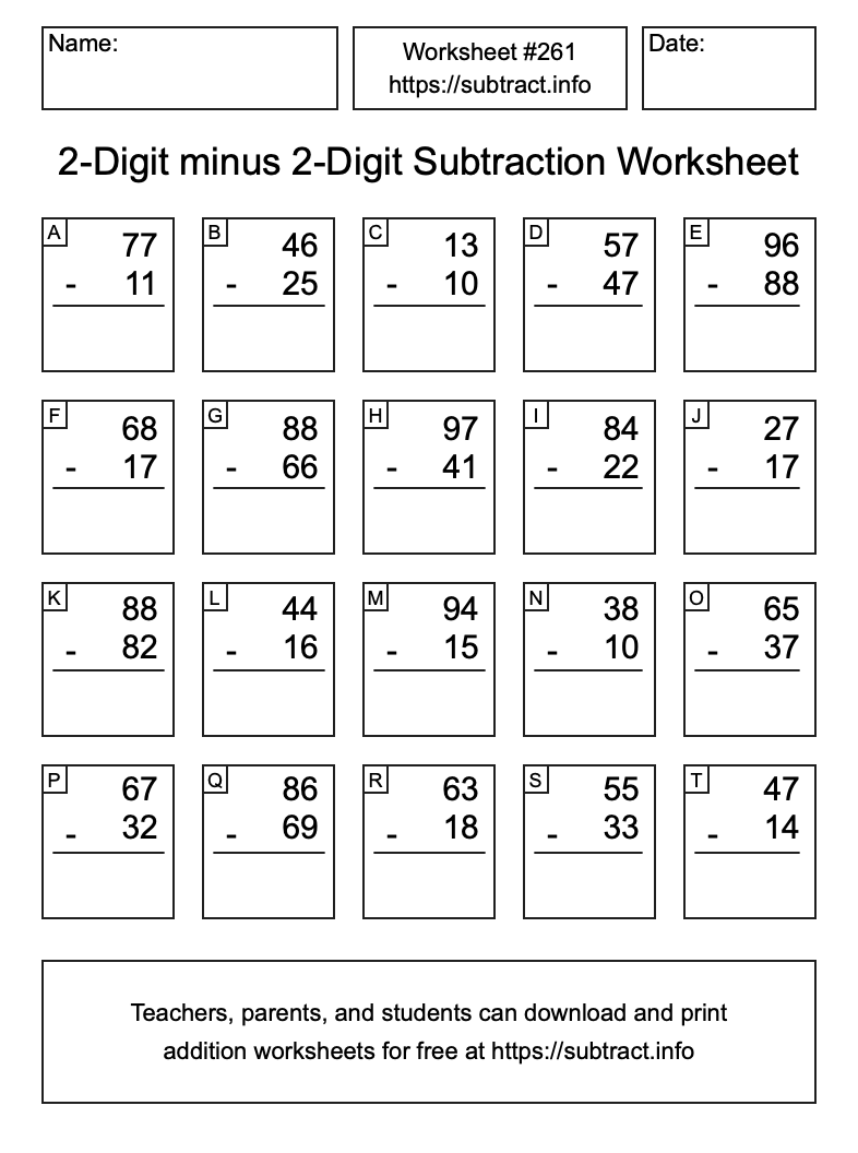 Here is the 2-Digit minus 2-Digit Subtraction Worksheet #261. Print and/or save the worksheet using the buttons below the image. You can also drag or right-click on the image to download it to your device.