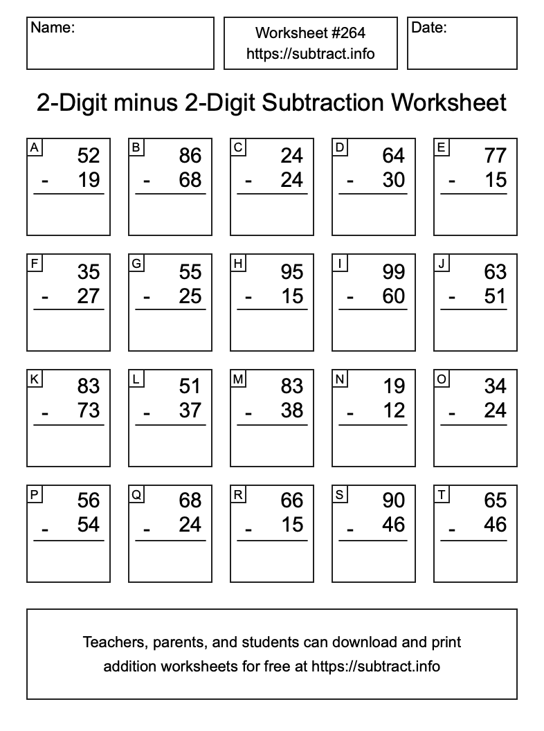 Here is the 2-Digit minus 2-Digit Subtraction Worksheet #264. Print and/or save the worksheet using the buttons below the image. You can also drag or right-click on the image to download it to your device.