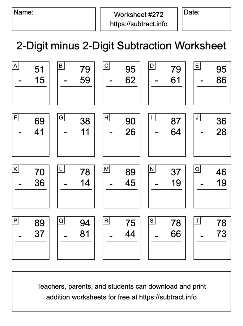 Here is the 2-Digit minus 2-Digit Subtraction Worksheet #272. Print and/or save the worksheet using the buttons below the image. You can also drag or right-click on the image to download it to your device.