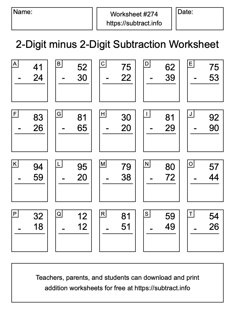 Here is the 2-Digit minus 2-Digit Subtraction Worksheet #274. Print and/or save the worksheet using the buttons below the image. You can also drag or right-click on the image to download it to your device.
